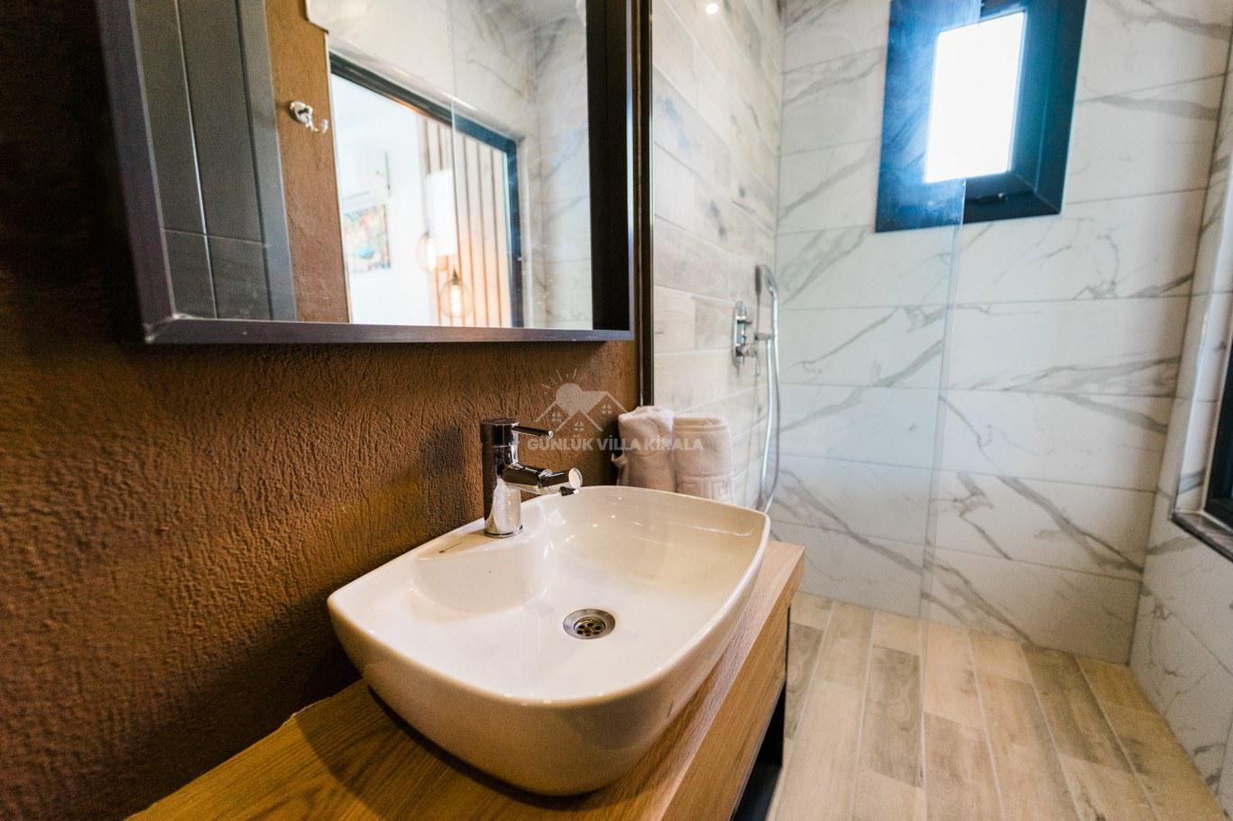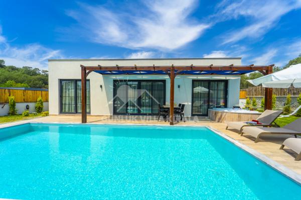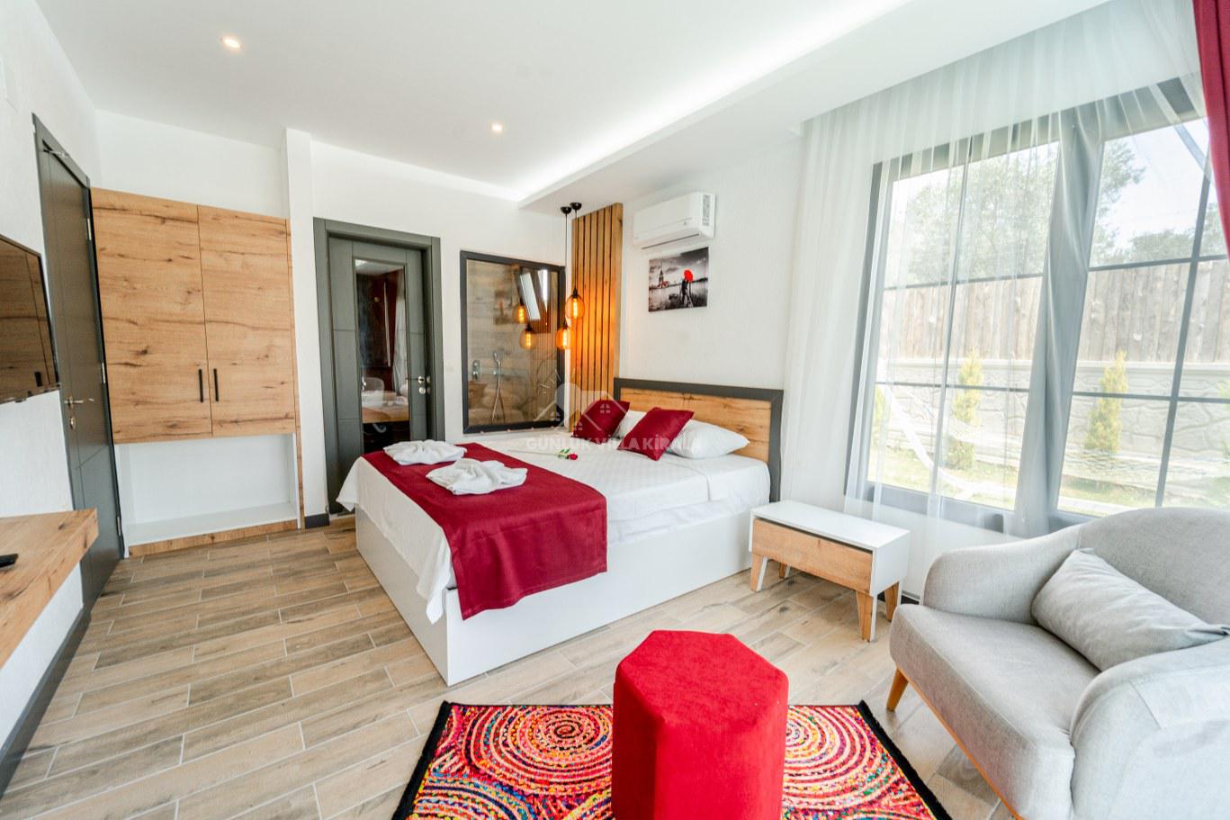Villamız 2 yatak odası ile toplamda 4 kişi kapasiteli olup, bahçe ve havuz terası korunaklıdır. Bu özellikleri sayesinde villamız, mutaassıp aileler ve balayı çiftleri için ideal bir seçenektir.