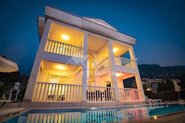Salon: Şomine olup içerisinde oturma grubu, WC, uydu alıcı, LCDTV ,internet, klima, yemek masası, sandalyeler ve havuza çıkış bulunmaktadır.Villada alarm ve kamera mevcuttur.