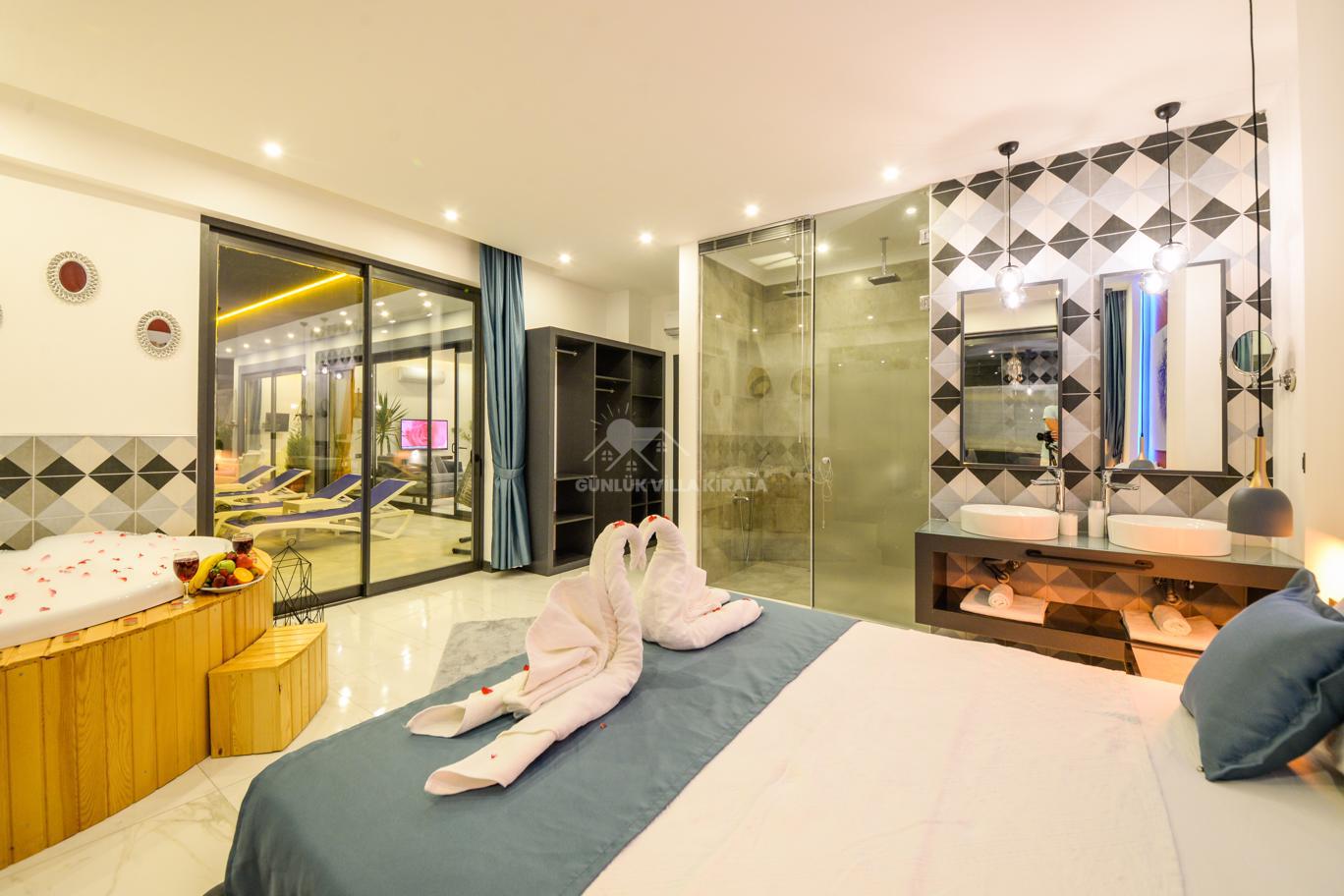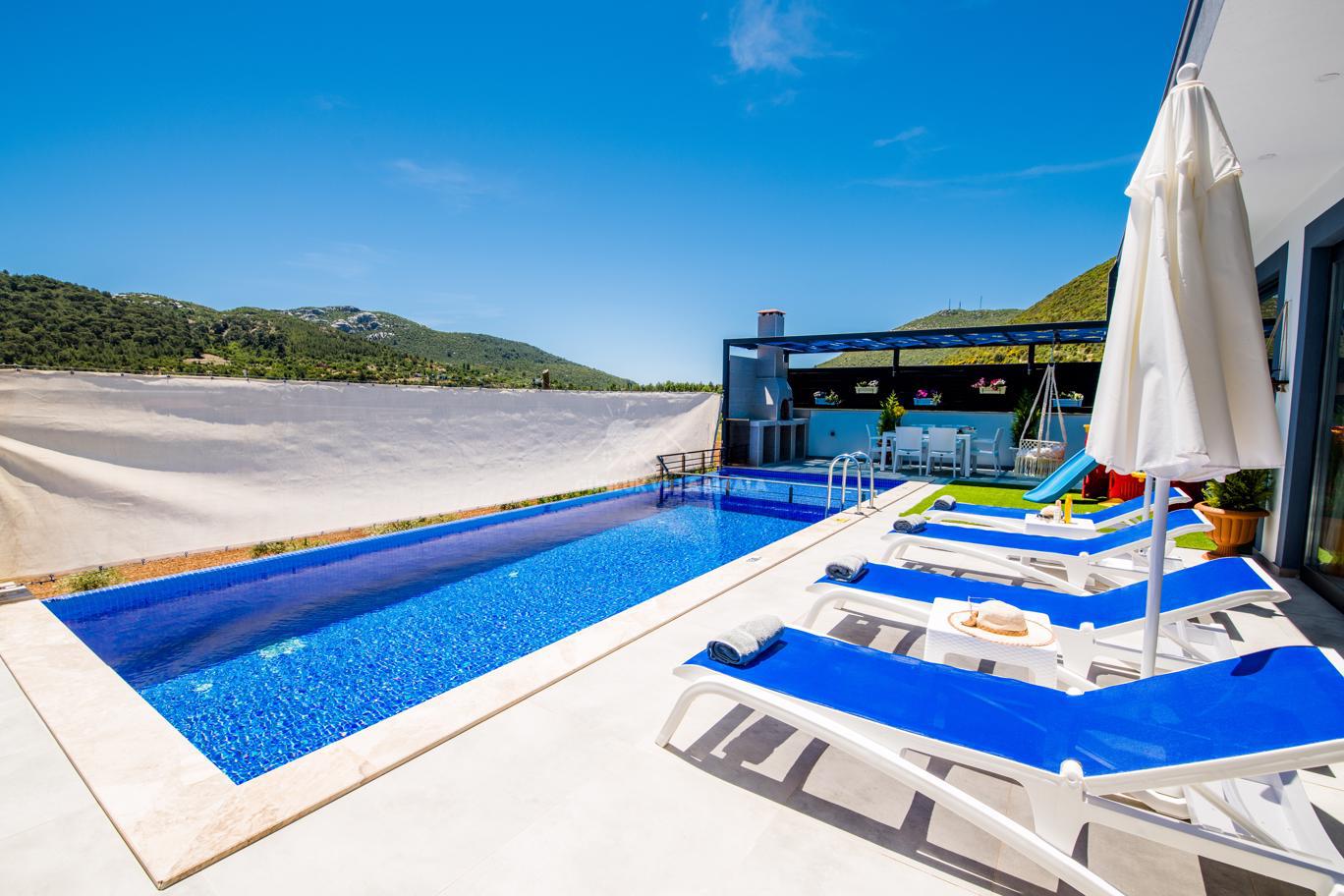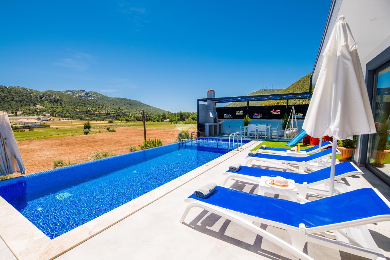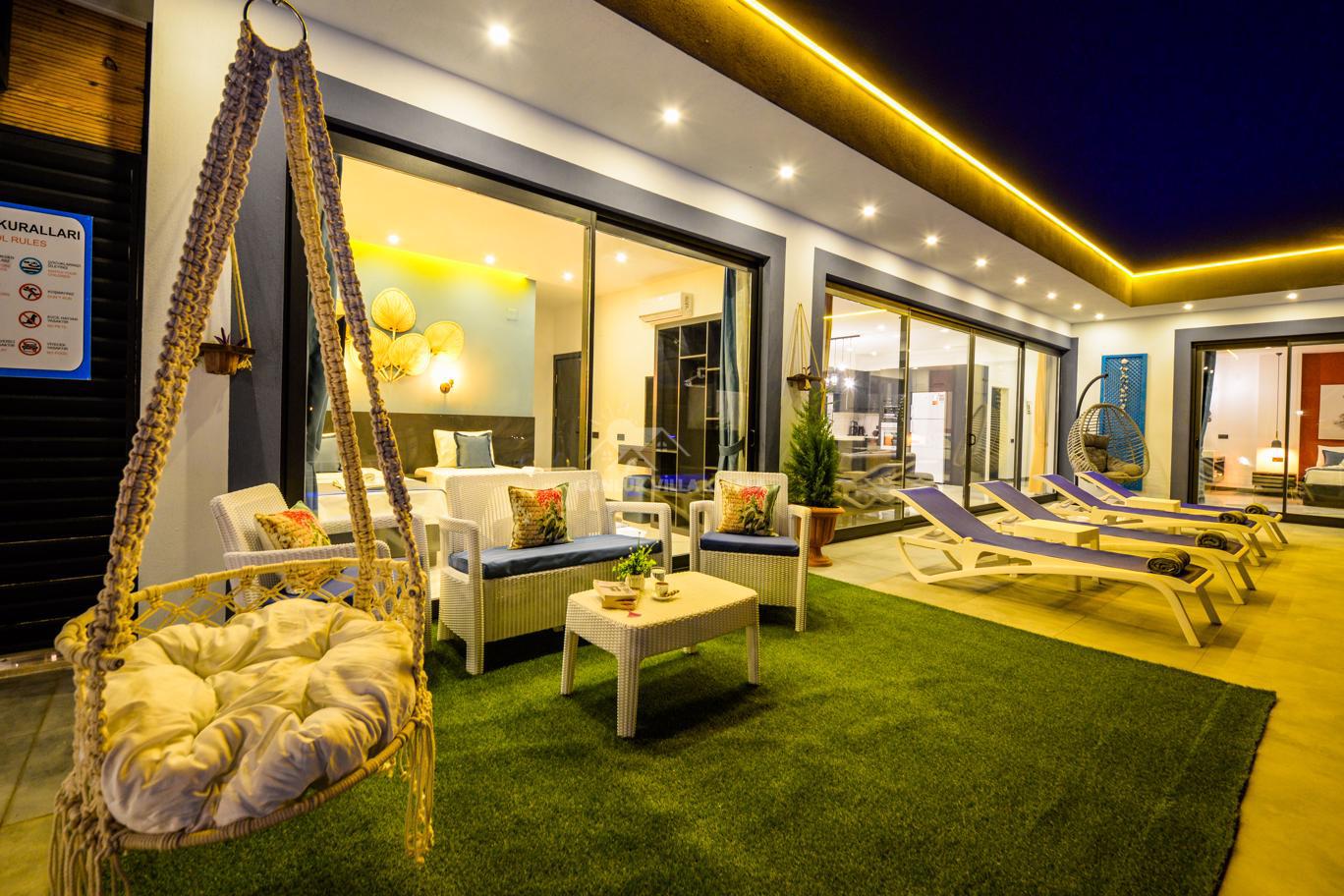 Kalkan'ın huzurlu köyü Sarıbelen'de bulunan Villa Lavinya, sadece 15-20 dakikalık mesafeyle Kalkan merkezinden ayrılarak doğanın sakinliğini ve temiz havasını sunuyor. Bu villa, doğa ile iç içe, şehir hayatının gürültüsünden uzakta eşsiz bir tatil imkanı sağlamaktadır. Villa Lavinya, özel yüzme havuzuyla birlikte, harika doğa manzarasına sahip rahat ve şık odalarıyla keyifli bir tatil deneyimi sunmaktadır. Doğal güzellikler eşliğinde sessiz ve sakin bir ortamda dinlenmek için mükemmel bir seçenektir. Villa, 2 yatak odasıyla 4 kişiye kadar konaklama kapasitesine sahiptir ve havuz ve teras alanı da koruma altındadır. Ayrıca çocuklu misafirlerimiz için çocuk havuzu da bulunmaktadır. Tatilinizi tamamlayıcı özelliklerden biri olan sauna ve jakuzi ise yatak odasında yer alır ve misafirlerimize bir yılın yorgunluğunu atmaları için ideal bir fırsat sunar. Villa Lavinya, tam donanımlı mutfağı ve tatilinizi eksiksiz hale getirecek diğer detaylarıyla izole ve kalabalıktan uzak bir tatilin keyfini çıkarmanızı sağlar. İhtiyaç duyabileceğiniz her şeyi bir arada bulabileceğiniz bu villa, güvenli ve keyifli bir tatil imkanı sunmaktadır.