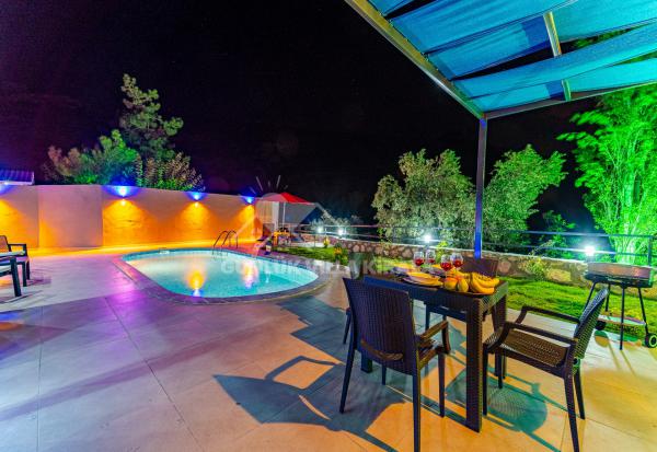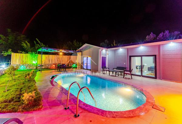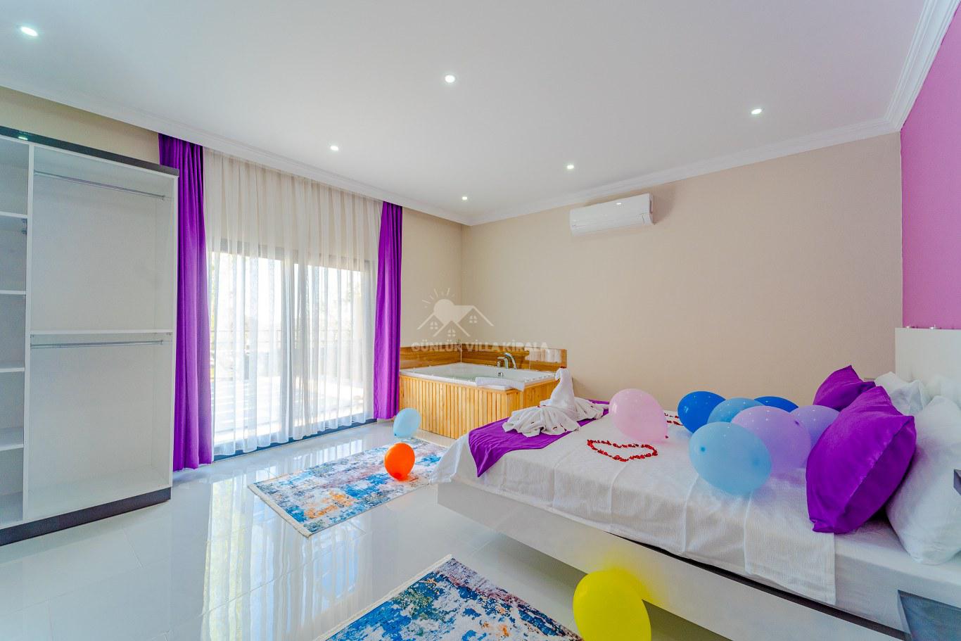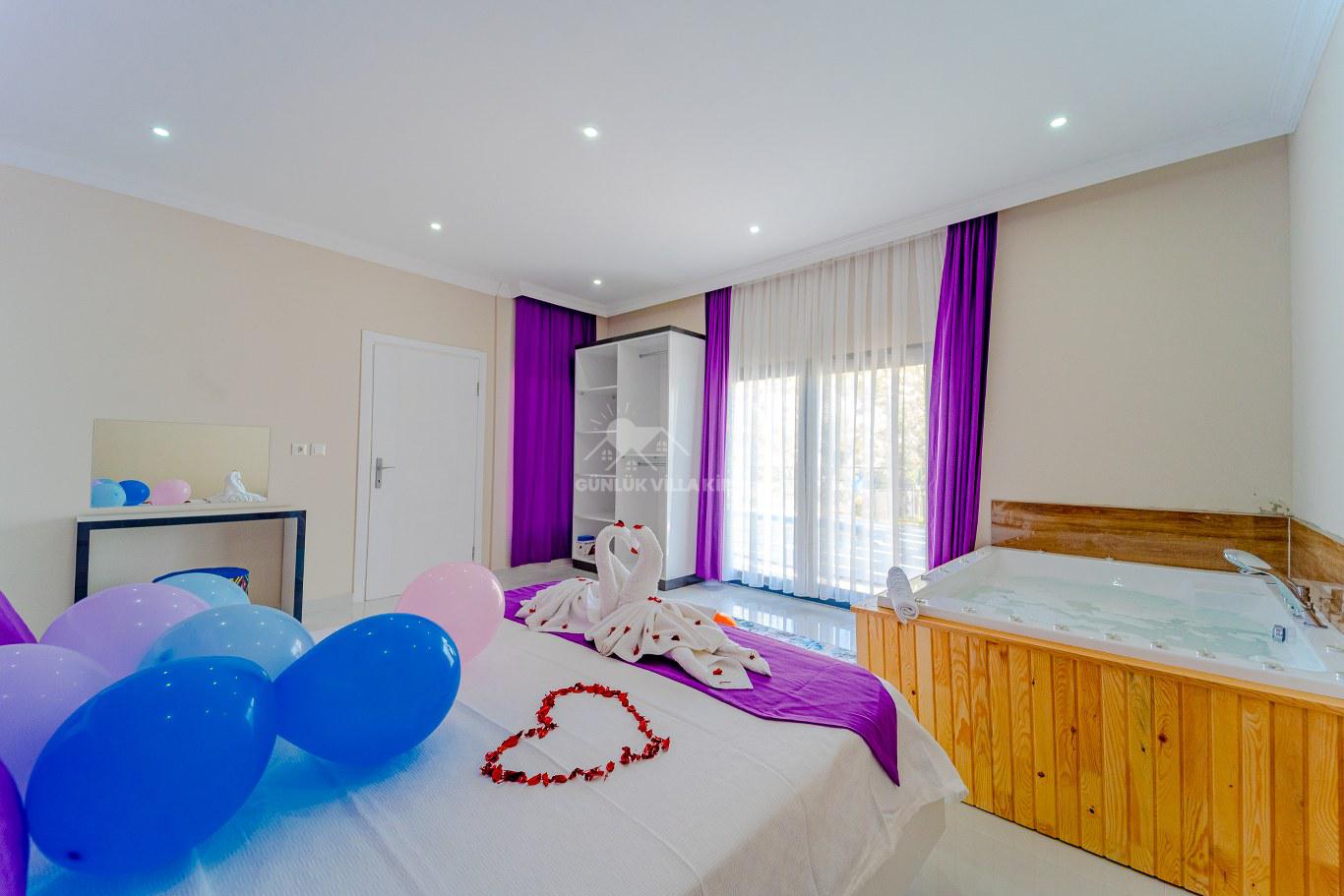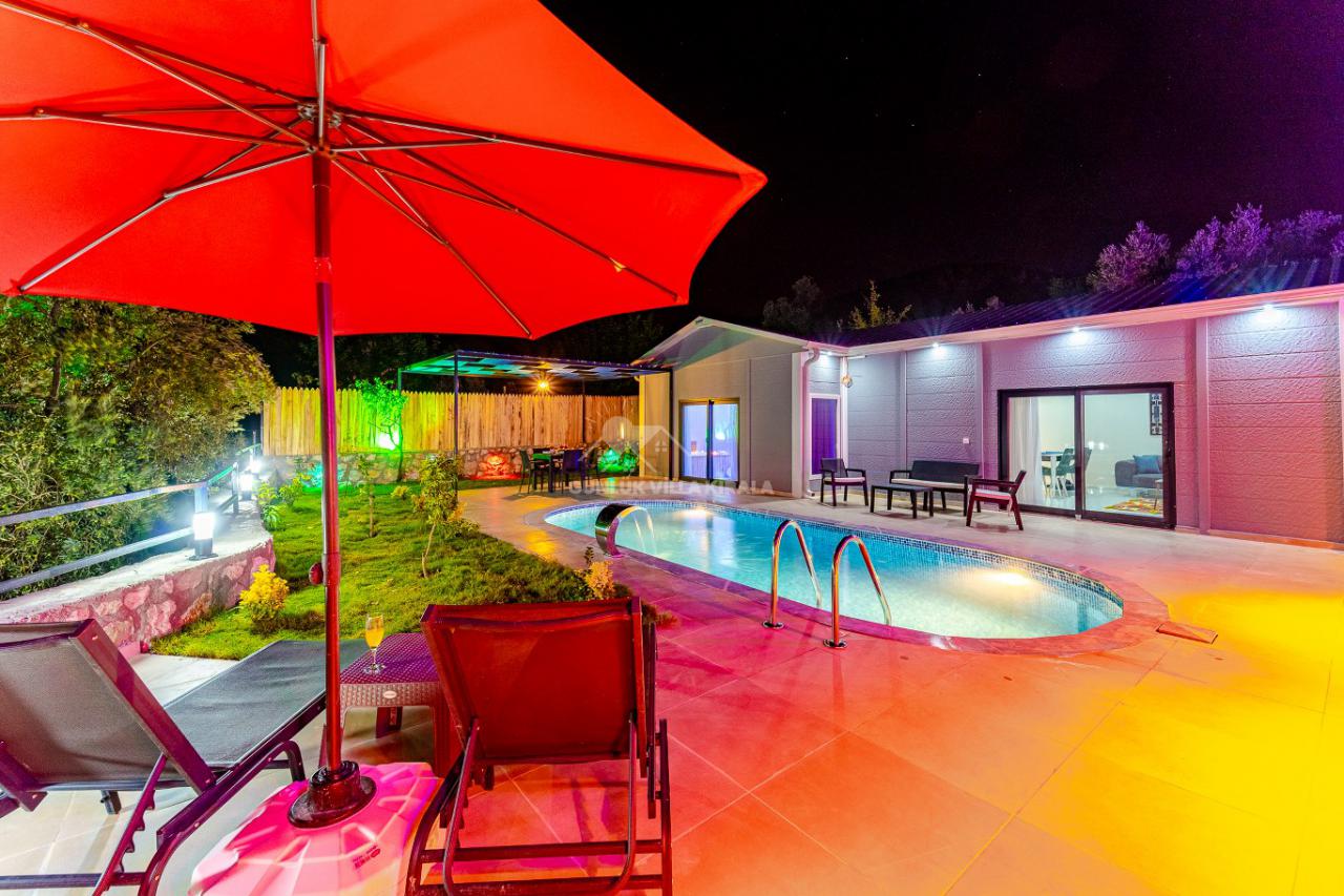 Villanın içi canlı renklerle tasarlanmış olup, tam korunaklı havuzuyla balayı misafirleri için mükemmel bir ortam sunar. Doğa içindeki konumuyla dinlendirici bir balayı tatili için harika bir fırsat sunmaktadır. Villamızda tek yatak odası bulunmaktadır. Yatak odasında çift kişilik yatak, klima, banyo ve jakuzi mevcuttur. Salon bölümünde ise mutfak, oturma grubu, televizyon ve klima bulunmaktadır. Genel not: Doğa içinde konumlanan tüm villalarımız düzenli olarak böcek ve haşerelerden arındırılmakta ve ilaçlanmaktadır. Doğa içindeki konumları sebebiyle merkezde bulunan evlere göre böcek çıkma olasılıkları daha yüksektir. Bu not sadece belirtilen eve özgü değil, doğa içinde bulunan tüm evler için geçerlidir.